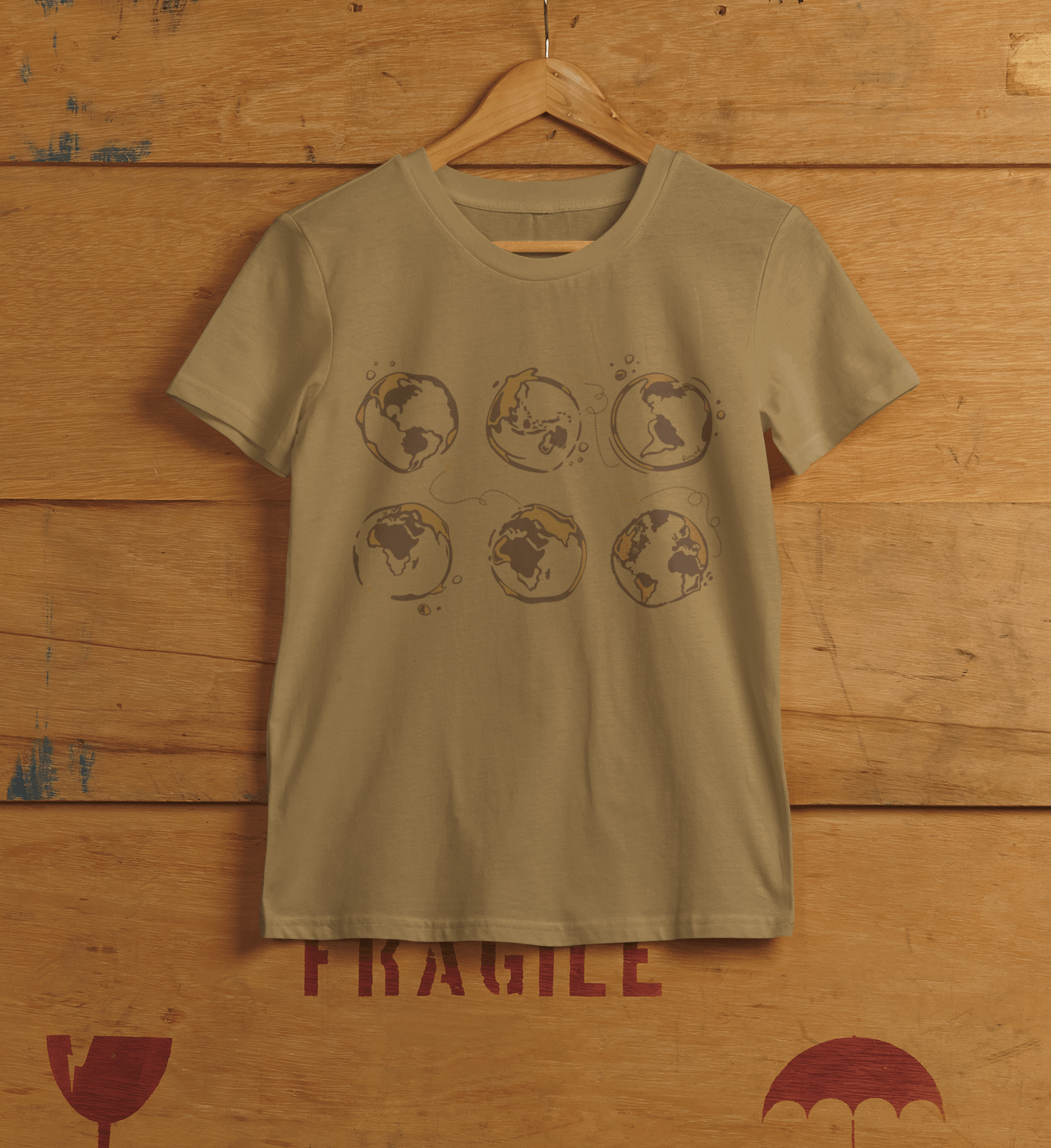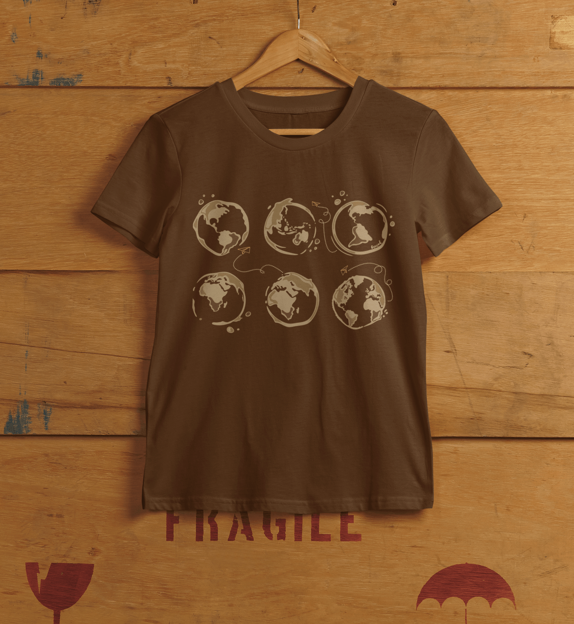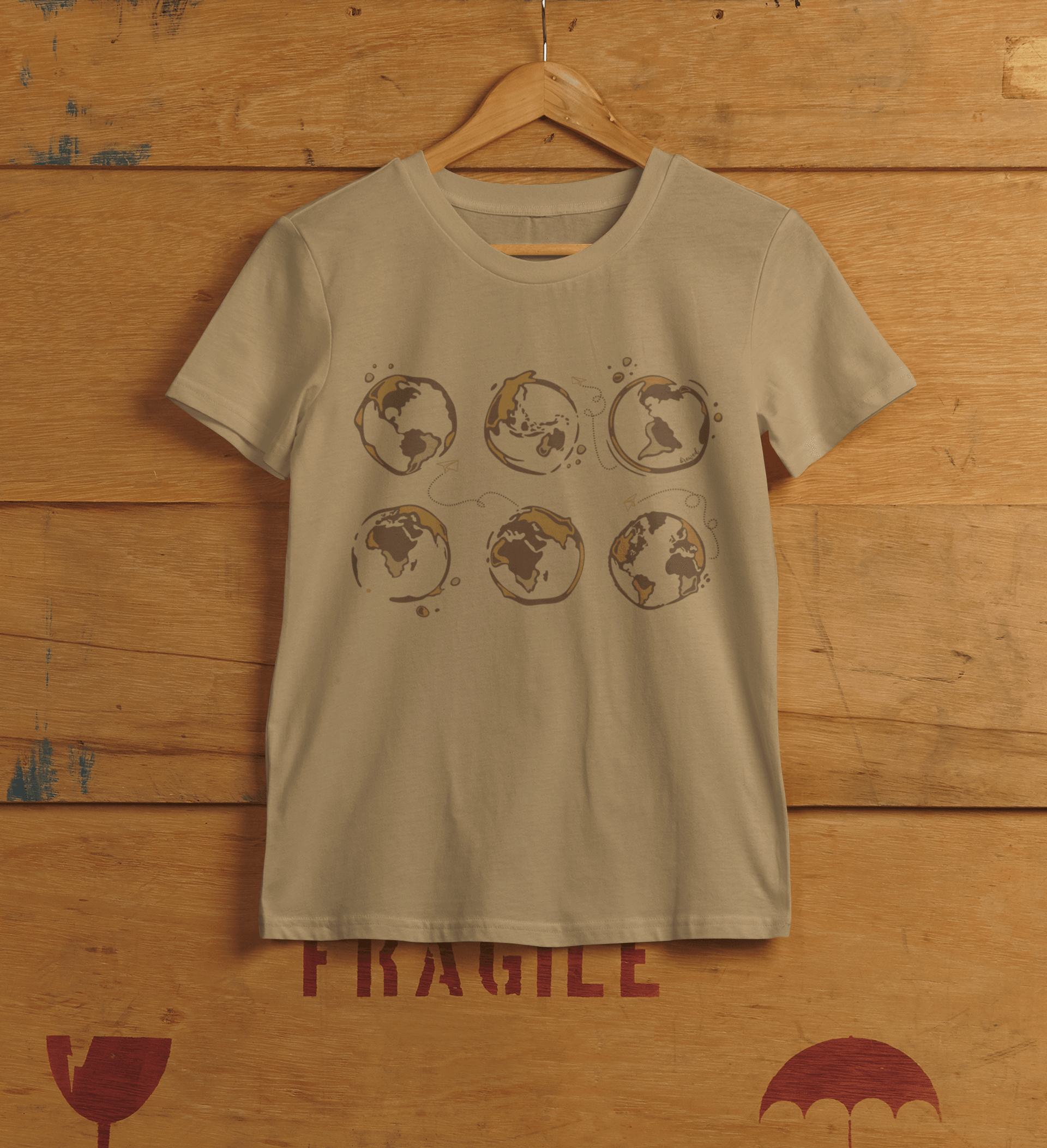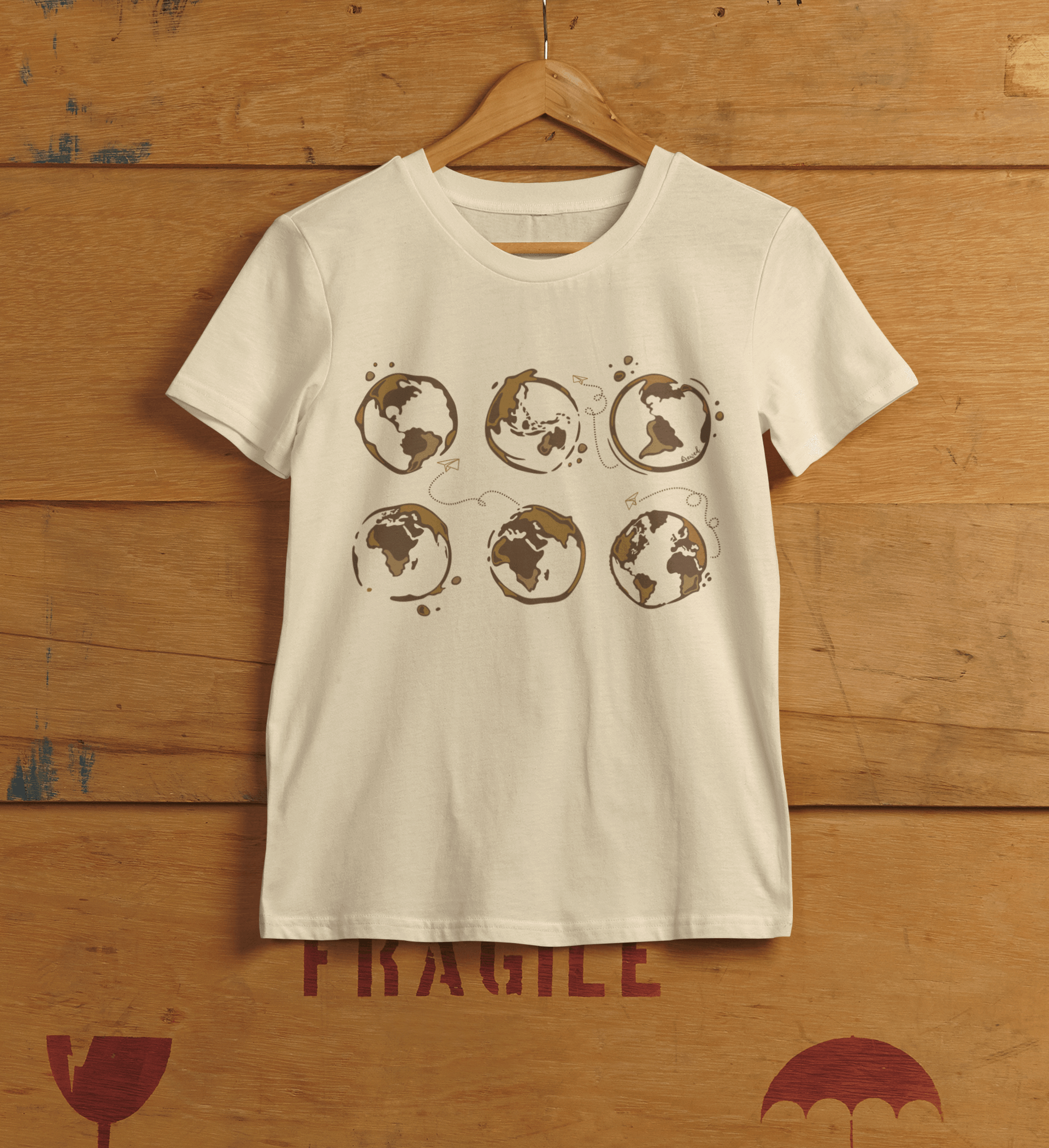 This t-shirt combines the spirit of travel and the love of coffee. The unique graphic features coffee rings shaped like continents and paper planes, making it ideal for the adventurous coffee lover. Made from 100% cotton.